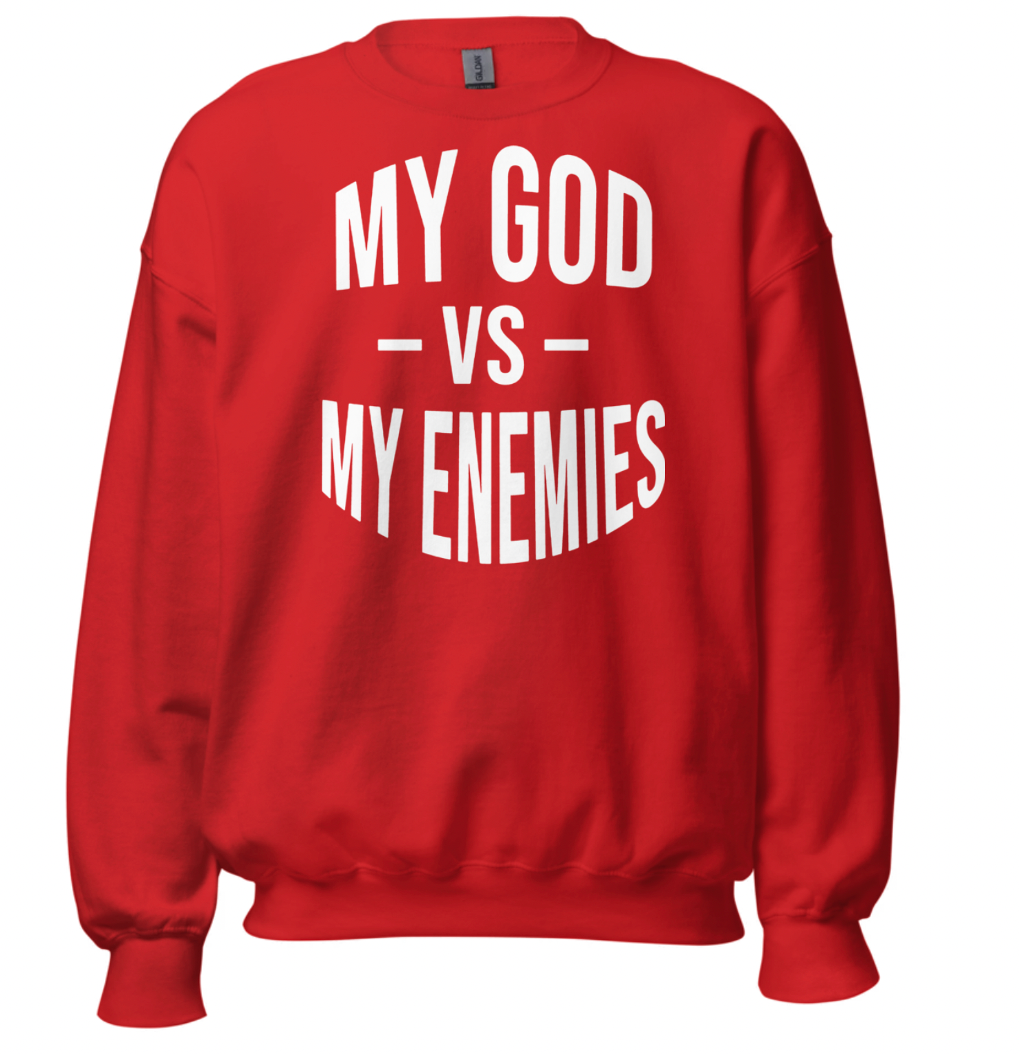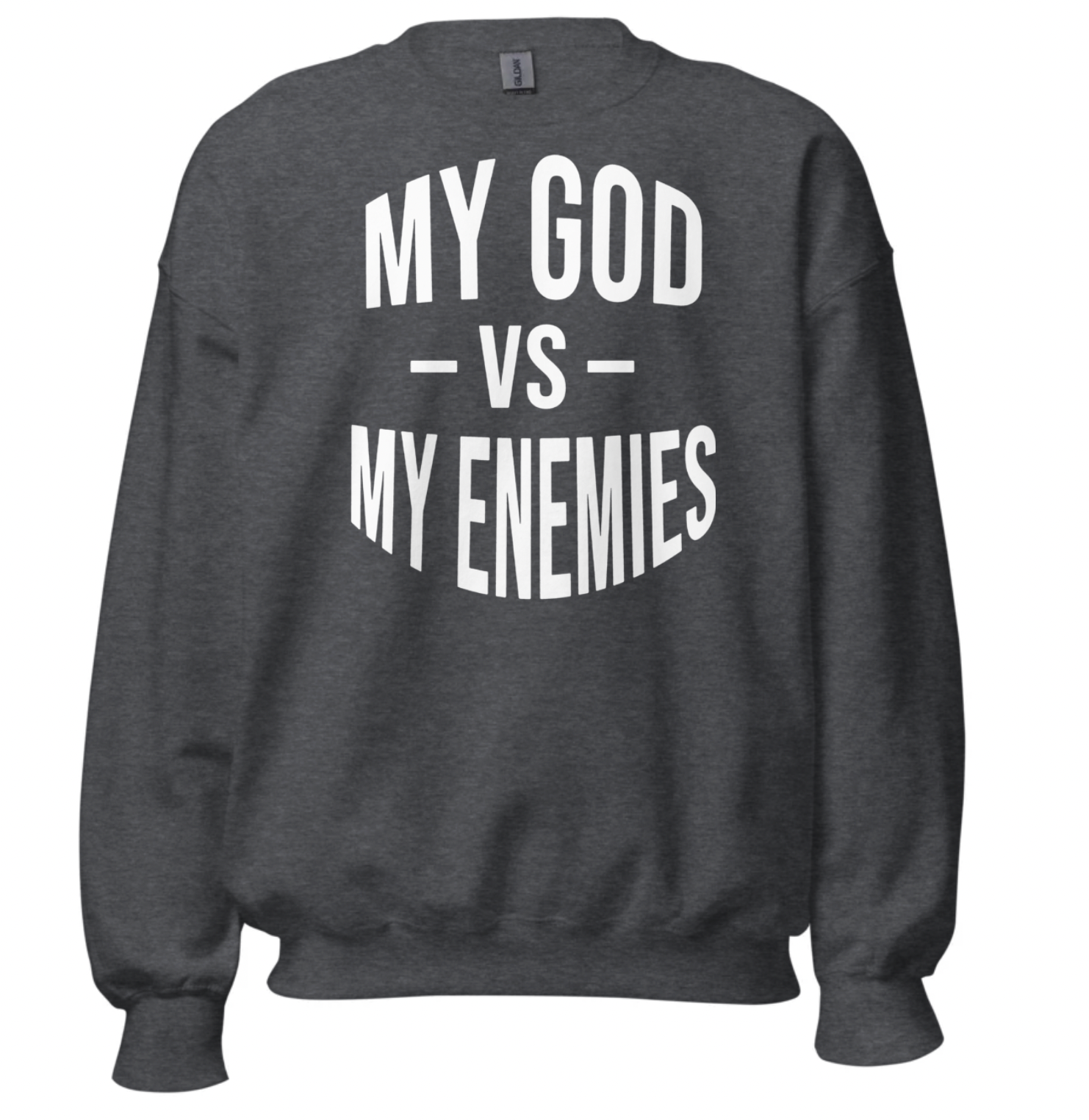 Front chest print: “My God vs My Enemies” — bold, faith-driven typography